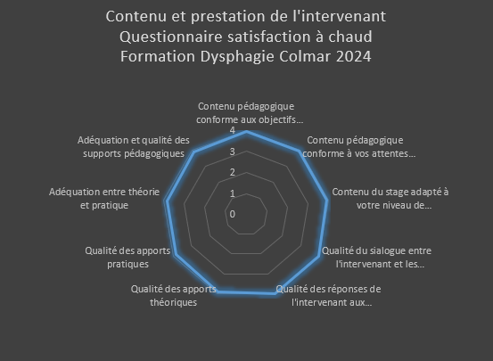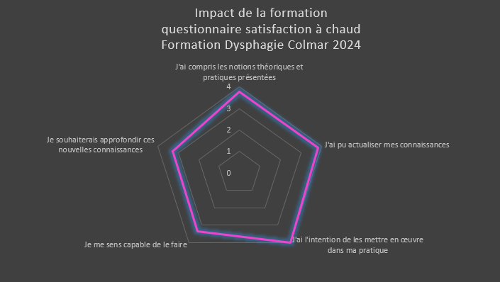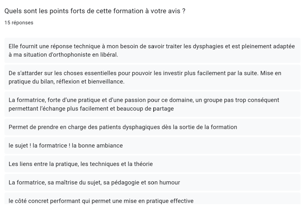 j’ai formé 49 orthophonistes et logopèdes à cette thématique « le rôle de l’orthophoniste dans les dysphagies d’origine neurologique et neurodégénérative », via mon organisme ou pour le compte d’autres organismes de formation. 100% des stagiaires qui ont suivi cette formation la recommandent* ! *statistique issue de l’analyse des réponses à la question « recommanderiez-vous cette formation à un collègue ? » incluse dans le questionnaire de post formation
