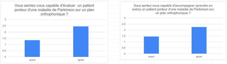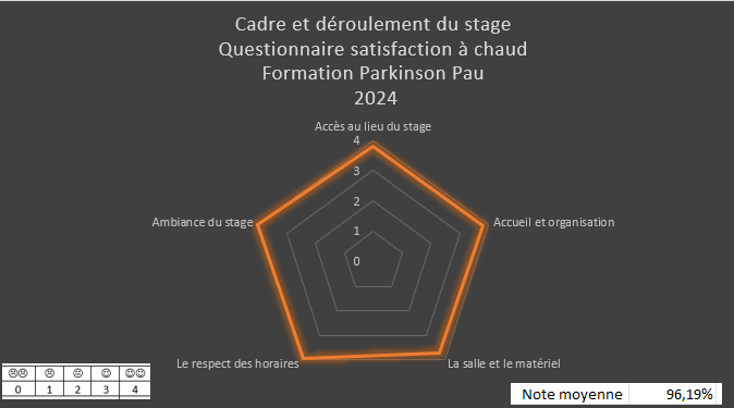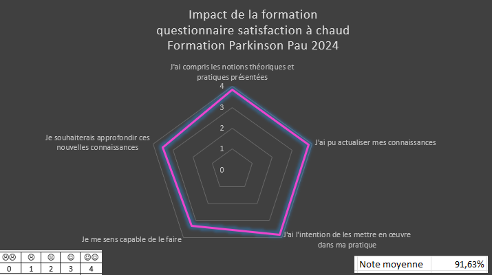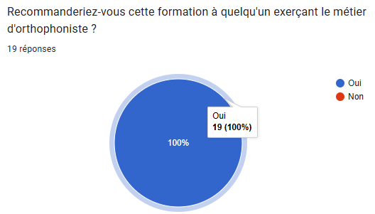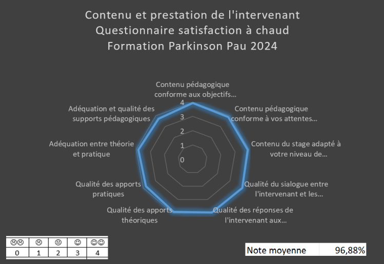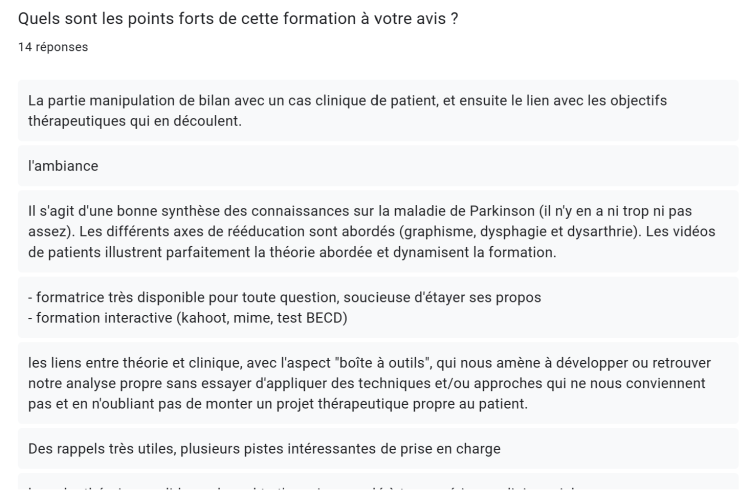 En 2022, 2023 et 2024, j’ai formé 230 orthophonistes et logopèdes à cette thématique « l’accompagnement orthophonique auprès des personnes atteintes de maladie de Parkinson », via mon organisme ou pour le compte d’autres organismes de formation. Je suis fière de vous dire que 96.9% des stagiaires qui ont suivi cette formation la recommandent* ! *statistique issue de l’analyse des réponses à la question « recommanderiez-vous cette formation à un collègue ? » incluse dans le questionnaire de post formation.